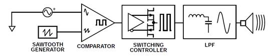 Class D amplifiers can be described simply as switching amplifiers or pulse width modulation (PWM) amplifiers. The figure below shows the signal flow of a basic Class D amplifier.