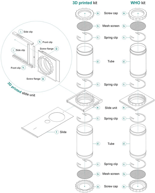 Figure 1. WHO bioassay kit and equivalent3D printingpart.The cross-sectional view shows the sliding unit3D printingVersion assembly.