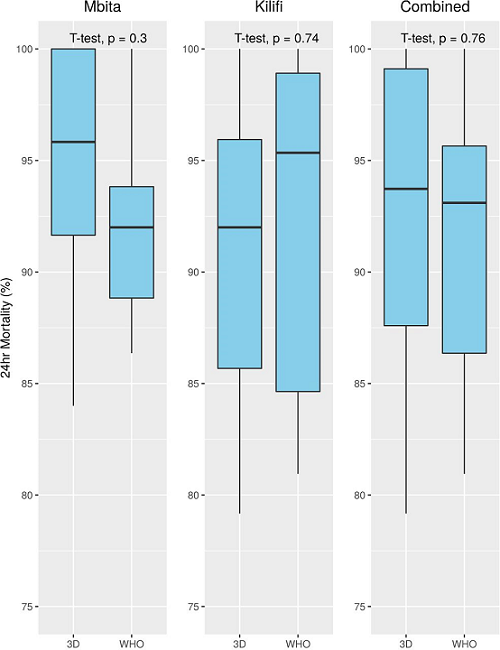 Figure 3. Bioassay results, comparing the WHO bioassay kit and3D printingThe mortality of Mbita, Kilifi kits and their combined results. Use the t test to compare the means of each test.