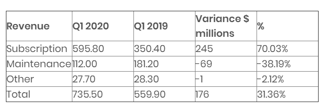 As a performance indicator, the company’s annual recurring revenue (ARR) is also considered throughout the report, which includes maintenance and subscription plans. Compared with the same period in fiscal year 2019, the ARR in the first quarter of fiscal year 2020 increased by 33% to $2.83 billion.