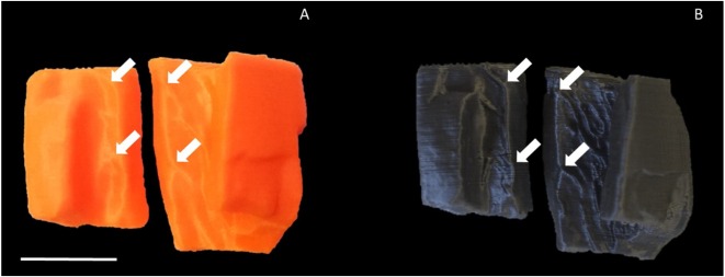 Virtual model3D printingIn the copy, the μCT scan model (right) shows stronger ridge details compared to the SLS scan model (left). The picture comes from Science Direct.