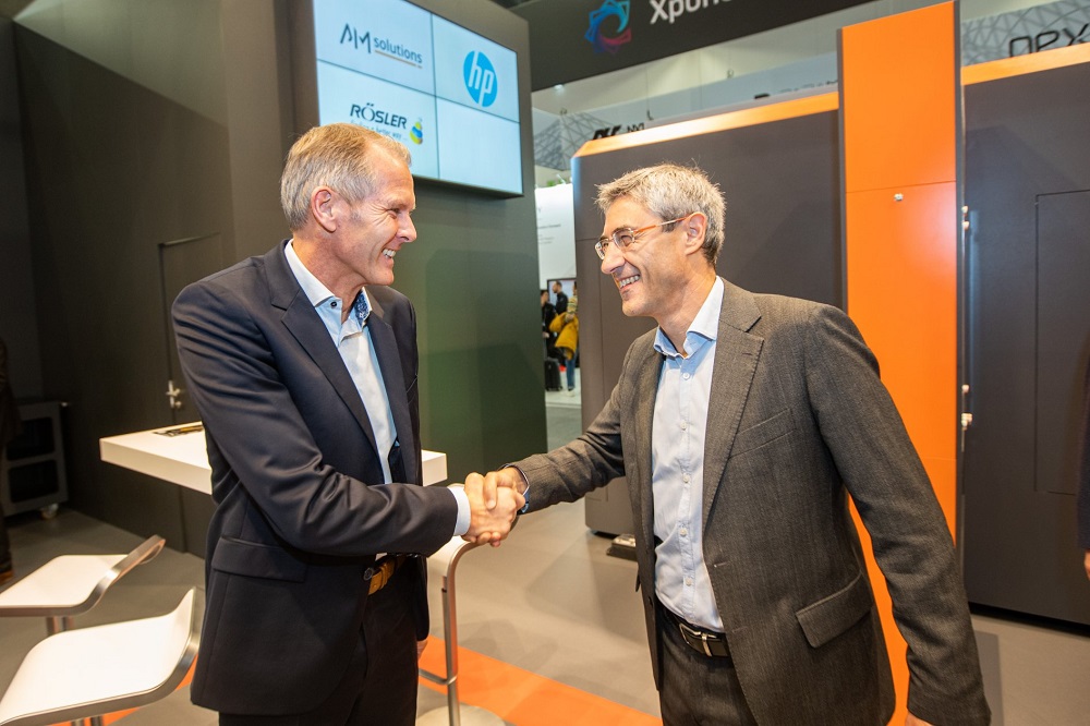 Stephan Rösler, CEO of the Rösler Group with HP of Formnext 3D printingShaking hands with Ramon Pastor, Interim Head of Digital Manufacturing. Image via RöslerGroup.