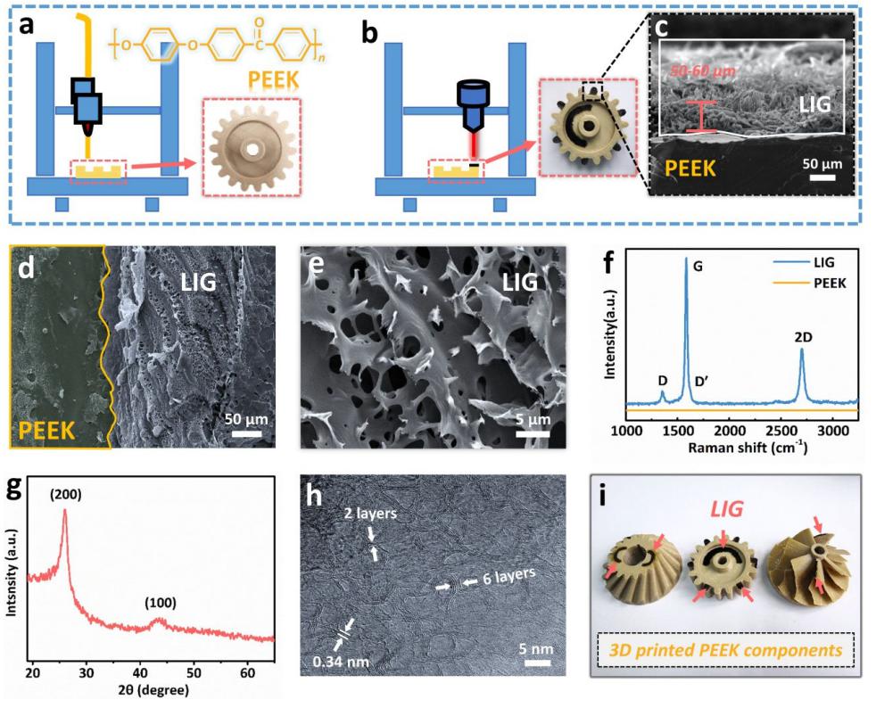 The research team used the early-stage polyether ether ketone (PEEK) material3D printingThe basis of (Polymers, 2019, 11, 656). The PEEK structure printed by INTAMSYS FUNMAT HT is processed by a CO2 laser with a wavelength of 10.6 μm. A PEEK-based laser-induced graphene (PEEK-LIG, Laser Induced Graphene) with dual functions of conduction and sensing is obtained. Through further processing, a smart structure is obtained (Figure 1). The intelligent structural part can be applied in a variety of scenarios, has the advantages of excellent mechanical properties, high sensitivity, high stability, etc., and its preparation method is simple and low in cost.