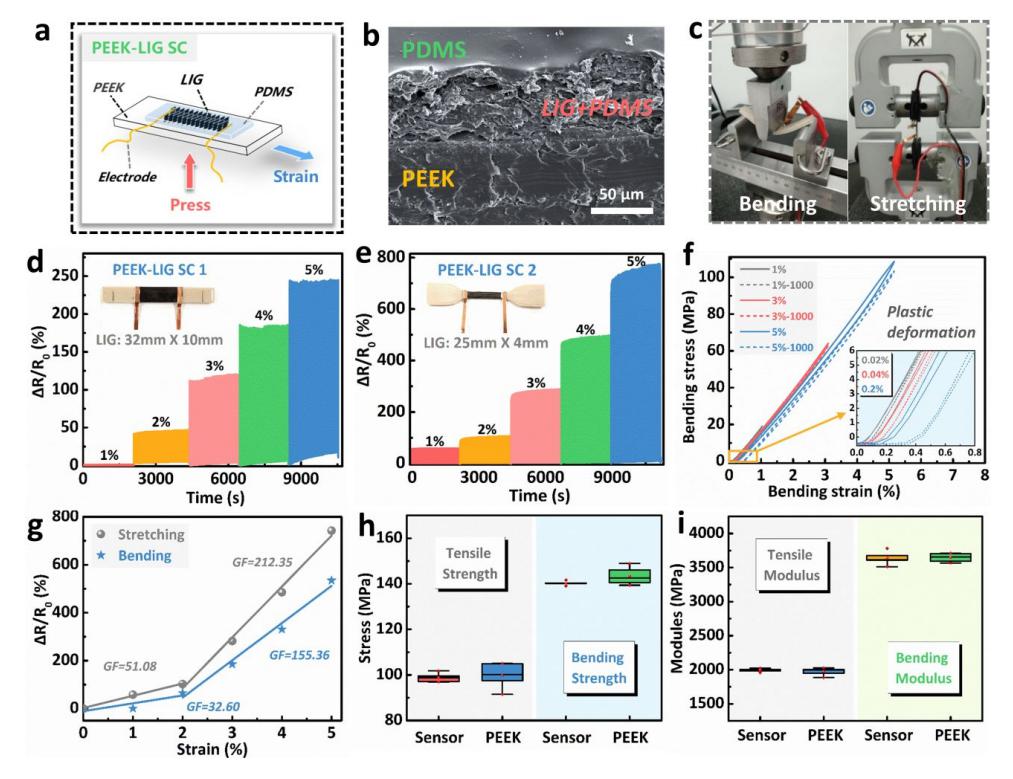 Figure 2 Structure and strain sensing performance test of PEEK-LIG smart structural parts