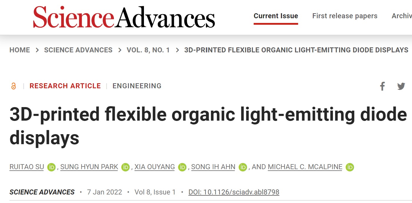 On January 10, 2022, researchers at the University of Minnesota, Twin Cities (UMTC) have developed a fully 3D-printed organic light-emitting diode (OLED) display similar to the ones found in commercial TVs and smartphones.