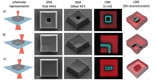 In order to avoid the photodegradation of ONB group caused by light in the process of acrylic resin photo-initiated polymerization, the research team determined that the femtosecond laser has a wavelength of 900 nm and a power of 8 mW through screening.3D printingThe optical writing rate is 100 μm s-1; the laser erasing wavelength is 700 nm, the average power is 10 mW, and the solvent system is DMSO.The research team uses the above-mentioned 900 nm wavelength laser3D printing15 × 15 × 5 μm3 cube structure, followed by a 700 nm wavelength laser to selectively erase the cube structure, and finally obtain a variety of complex 3D structure devices. The SEM test shows that the microstructure morphology formed by optical erasure has smooth edge structure and good spatial regularity, and has excellent practicability in the preparation of complex microstructure 3D structure devices such as microfluidic devices.