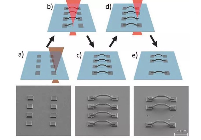 To further demonstrate the compatibility of the ONB-containing photoresist resin with commercial photoresist resins, the researchers used ONB-containing photoresist3D printingPrepare a 5 × 5 μm2 square base, and use commercial acrylic as the material to prepare a linear connecting member between the bases. Based on the remaining reactive functional groups in the ONB-containing resin matrix, the base resin can form a covalent bond with the linear resin. Based on the 700 nm light erasability of the ONB resin base, partial individual devices in the 3D microstructure array can be completely erased through selective exposure.