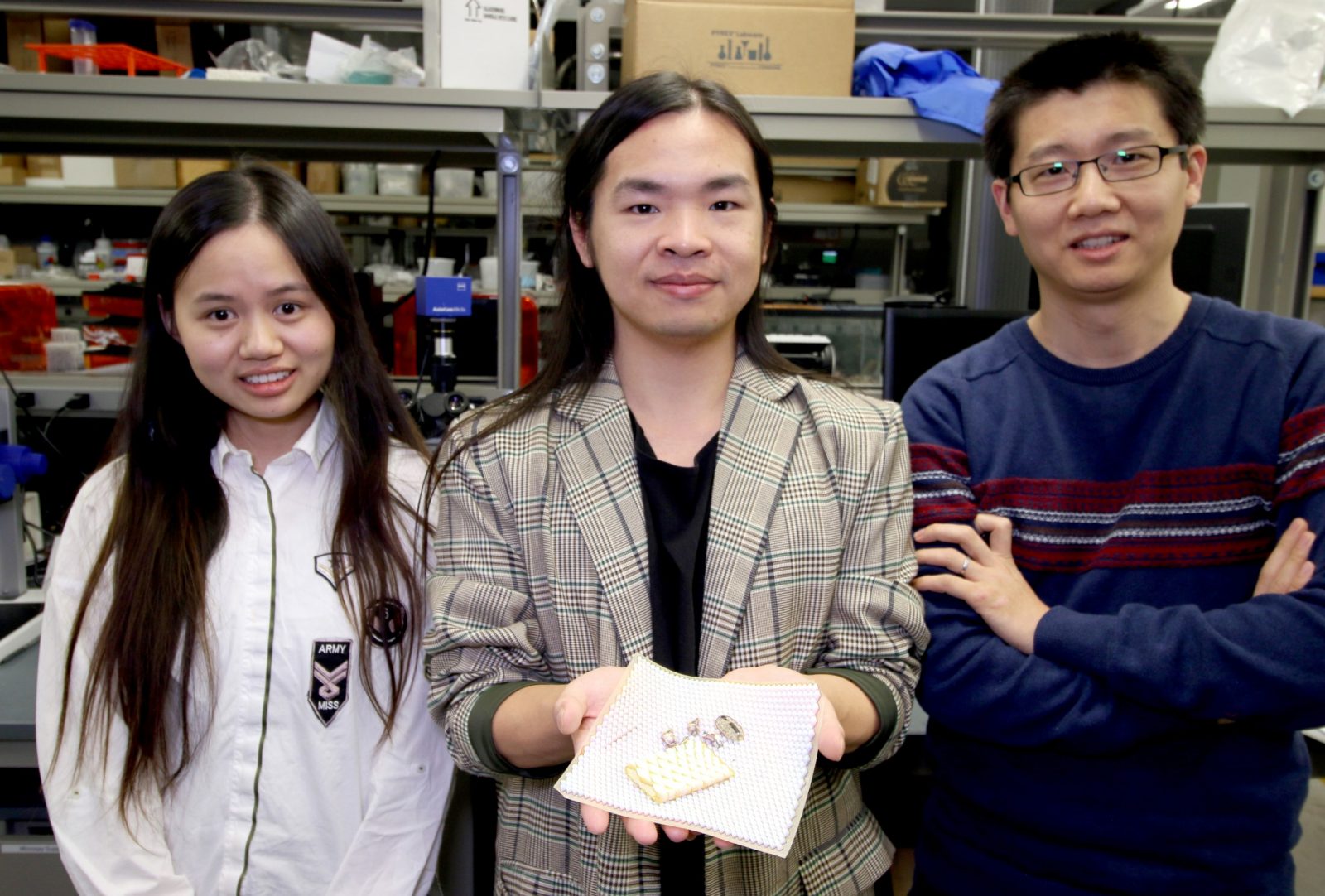 Assistant Professor of Mechanical Engineering Li Ling (right) and doctoral students Ting Yang (left) and Dengfei (邓志飞) as the center, holding3D printingArmor. Picture from Virginia Tech.