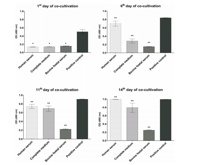 “The first group was incubated in human serum, the second group was supplemented with 10% FBS and 1% ATB in a medium containing Alpha-modified minimal essential medium, and the third group was incubated in 10% FBS.”