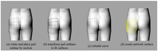 Steps to create the pad outline and bottom surface: (a) Rotate and place the pad outline section by section; (b) Change the outline of the pad to fit the surface; (c) Rebuild the curve; (d) Build the network surface.
