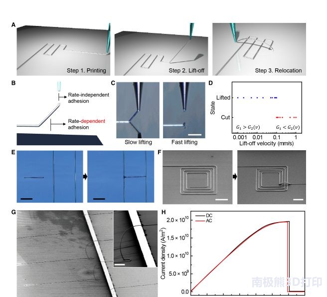 Figure 2: Reconfiguration of liquid metal into a three-dimensional structure. (A) Schematic diagram of each reconfiguration step. (B) Schematic diagram of two adhesion forces during reconfiguration. (C) Photograph of Egain peeled off (left) and cut (right) from the substrate. Scale bar, 100 mm. (D) The relationship diagram between pipeline state and nozzle lifting speed. (E) Optical micrograph of reconfiguration. The printed horizontal line (left) is lifted and reconfigured (right). Scale bar, 200 mm. (F) Scanning electron microscope image of the reconfigured square coil. The inner end of the square coil (left) is lifted and reconfigured (right). Scale bar, 200 mm. (G) Scanning electron microscope image of Egain 3D bridge. Scale bar, 500 mm. Inset: Magnified scanning electron microscope image of a three-dimensional bridge. Scale bar, 200 mm. (H) Curve graph of applied deviation and response current density in EGaIn.