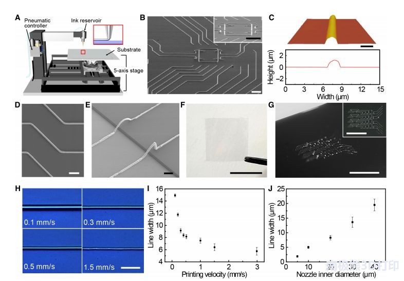 Figure 1: High-resolution printing of liquid metal. (A) Schematic diagram of the printing system. (B) Scanning electron microscope images of 2D and 3D high-resolution EGaIn patterns. Scale bar, 100 mm. Inset: SEM image of magnified 3D structure. Scale bar, 100 mm. (C) Print the AFM image and cross-sectional profile of the EGaIn line. Scale bar, 2 mm. (D) Scanning electron microscope image of a 1.9 mm wide EGaIn pattern. Scale bar, 10 mm. (E) Scanning electron microscope image of 3D pattern of EGaIn on PET film and epoxy resin (SU-8). Scale bar, 10 mm. (F) A photo of the high-resolution EGaIn pattern printed in (B). Scale bar, 1 cm. (G) Photograph of the interconnection pattern of EGaIn. Illustration: Top view photo. Scale bar, 5 mm. (H) Optical micrograph of EGaIn line printed according to printing speed. Scale bar, 40 mm. (I) The graph of the relationship between line width and printing speed. (J) The relationship between line width and nozzle inner diameter. The error bars in (I) and (J) indicate SD.