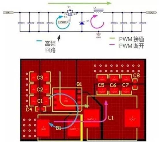 But there is input pulse current, which is the part you need to pay attention to in the layout. In Figure 1, this loop is labeled “High Frequency Loop” and shown in blue. The primary goal of your layout is to connect Q1, D1 and the input capacitor to a short, low-inductance loop. The smaller the loop, the lower the noise generated by the switch. If you ignore this, the power supply will not work effectively.