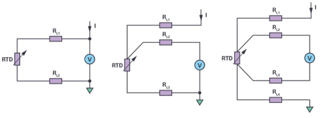 In order to generate the measurement voltage, the RTD needs an excitation current. Depending on the type of RTD, the voltage level varies from tens to hundreds of mV. The accuracy of the measurement system depends not only on the temperature sensor, but also on the selection of the appropriate measurement instrument, system configuration, and measurement circuit type. Depending on the number of wires, RTD sensors can be used in 2-wire, 3-wire or 4-wire measurement circuits. The comparison of these different measurement circuits is shown in Figure 1.