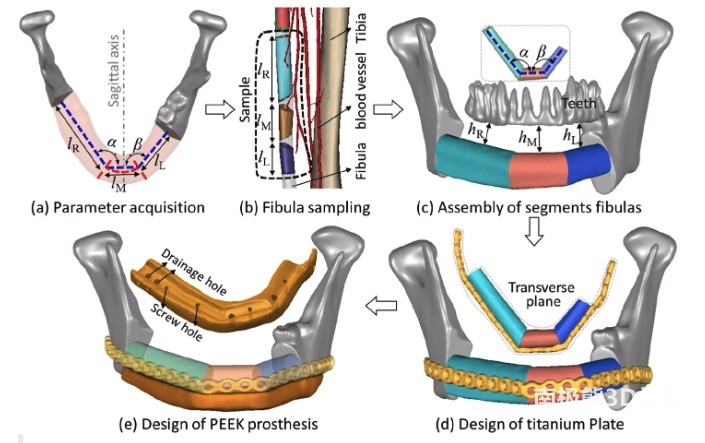 3D model, and determine the spatial position according to the occlusal datum and three height parameters (hR, hM, hL). Third, the fixation of the fibula segment is completed by designing a fixation plate that perfectly matches the fibula. Finally, use Boolean operations to establish the macroscopic shape of the PEEK implant on the original mandible and fibula, and fix the prosthesis around the mandible and fibula with screws.