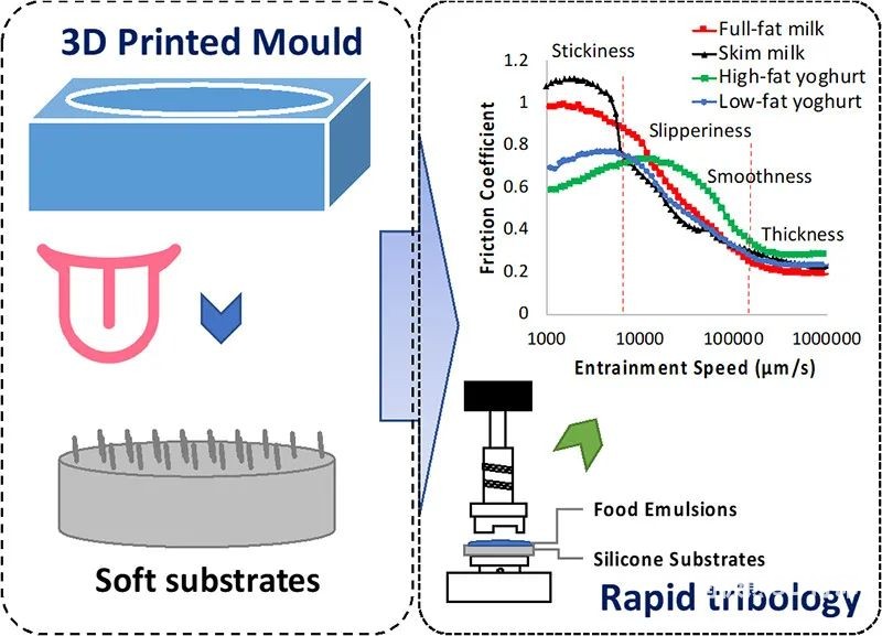The study reports a method that can be used to quickly manufacture soft elastomer substrates with different surface (roughness) and volume characteristics (elastic modulus and thickness).3D printingAuxiliary method for tribological measurement. The effects of substrates with different regular patterned surfaces, elastic modulus and thickness on the lubricating properties of four food emulsions (whole-fat and skimmed milk, high-fat and low-fat yogurt) were studied.