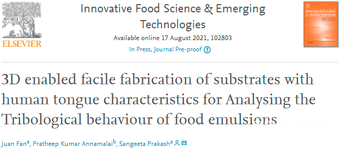 Academy of Sciences: Juan Fan (1 work)…, Sangeeta Prakash* (communication), etc. published an online publication titled “3D enabled facile” in the TOP journal Innovative Food Science & Emerging Technologies (IF: 5.916) fabrication of substrates with human tongue characteristics for Analysing the Tribological behaviour of food emulsions” research article.