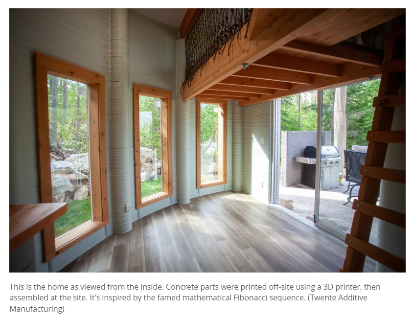 A house located in Proctor, BC, Fibonacci House is a Canadian one3D printingBuilt houses.