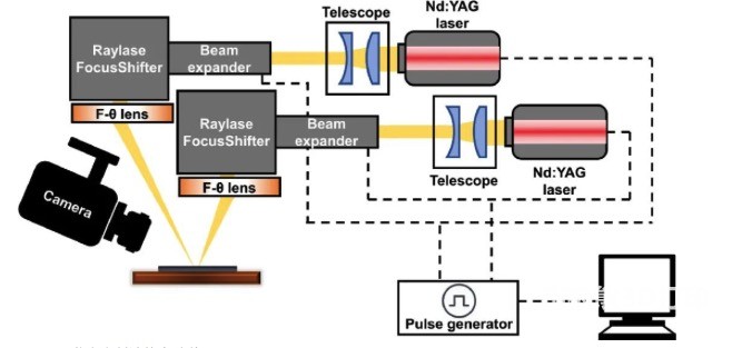 Figure 1 shows the dual laser experimental system used in this experiment.In this system, two lasers with a Gaussian energy distribution with a wavelength of 1070nm operate in a continuous wave mode as a laser energy source and a laser beam. After being narrowed by a focusing mirror, they pass through a3D scanningThe system performs magnification, a 2D scanning galvanometer and an F-θ mirror. The scanning range of each scanning system is 178 × 178 mm exp(2). By arranging two scanning galvanometers side by side, an overlapping scanning area is 20 × 178 mm exp (2). The two laser beams and the scanning galvanometer are controlled by a control card installed in the computer. A pulse generator is used to control the emission of the two lasers and thereby generate a spatial offset in the two laser beams. However, this pulse generator only affects the switching of the two lasers. Once the laser beam is turned on, it will continuously emit laser light in the form of continuous wave.