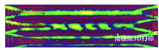 Figure 3 shows a confocal photo showing how two different scanning distances affect the final weld pool. The situation at this time is the vertical offset maintaining a constant value. The different colors in the picture represent the different heights of the samples, which vary from the surface of the undisturbed base material in purple to the height of about 100 μm above the surface of the substrate to yellow. At this time, the power of the two lasers is 80W, and the scanning speed is 150 mm/s. The amount of vertical segregation was kept at 120 μm, and three different scanning pitches were used, 140, 180, and 270 μm. For all three experiments, the top line to the bottom line was achieved by vertical offset. The two lasers move from left to right.