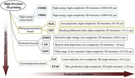 In this review, mainly from the perspective of preparation methods and materials, the above three types that can achieve high precision are proposed.3D printingTechnology, mainly focusing on these3D printingThe materials used in the technology, such as Metallic Inks, Polyelectrolyte Complexes, Sol-Gel Inks, Photoresists, and Protein-based Biomass Molecular (Protein-Based Biomolecules Materials), hybrid materials (HybridMaterials), biocompatible alloys (Valloy-120, Edura-180, and Palladium), etc.; and their application fields, including microelectrodes (Microelectrodes), photonic crystals (Photonic Crystals, Tissue Engineering Scaffolds, Micro/Nanoscale 3D Templates, Biological Tissues or Organs,