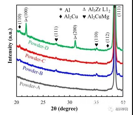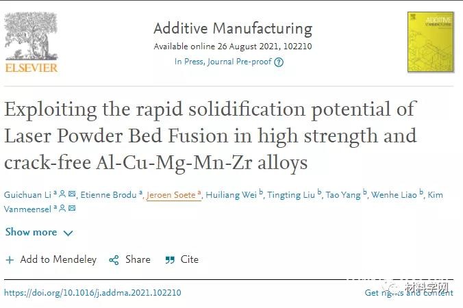 Here, researchers at Leuven University designed an Al-Cu-Mg-Mn based alloy with low thermal cracking sensitivity and high strength. First, use CALPHAD-based thermodynamic tools to design alloy compositions. Adding Cu, Mg, and Mn can improve mechanical properties through solid solution and secondary phase strengthening, while avoiding the formation of hot cracks. In addition, different contents of Zr are added to form primary Al 3Zr phases with different contents to refine grains, relieve thermal cracks and enhance strength, and form supersaturated Al-Zr solid solutions to enhance solid solution in the as-built state Precipitation strengthening after strengthening and heat treatment. Subsequently, the microstructure and mechanical characterization of the system was performed to evaluate the workability of L-PBF and the performance of the designed alloy. The finite element method was used to conduct numerical L-PBF molten pool simulation to understand the influence of L-PBF process parameters on the sensitivity of thermal cracks and the formation of non-equilibrium microstructures. In this way, the potential of L-PBF in forming non-equilibrium microstructures and exploiting its inherent strengthening effects will be explored. Relevant research results were published on Additive Manufacturing with the title “Exploiting therapid solidification potential of Laser Powder Bed Fusion in high strength and crack-free Al-Cu-Mg-Mn-Zr alloys”.