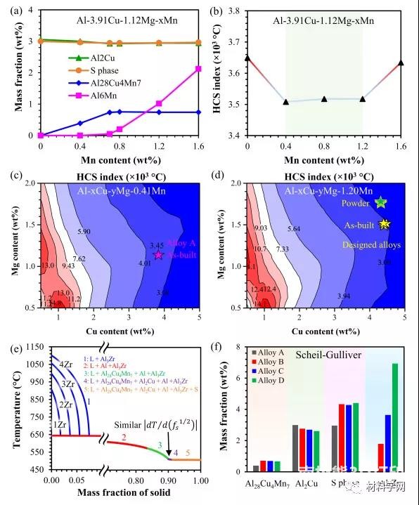 Figure 4 (a) Phase Fraction and (b) Hot Crack Sensitivity (HCS) Index, Kou based on Al-3.91Cu-1.12Mg-xMn alloy standardAs a function of Mn content. Comparison of HCS dT/dFsec12 has two Al-Cu-Mg-Mn quaternary alloy diagrams with fixed Mn content as a function of Cu and Mg content. (c) Al-xCu-yMg-0.41Mn, (d) Al-xCu-yMg-1.15Mn (wt%). (e) Phase transformation trajectories of Al-3.91Cu-1.12Mg-0.41Mn alloys with different Zr content. (f) The phase fractions of the four studied alloys solidified under Scheil-Gulliver conditions.