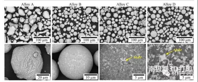 Figure 1 The morphology of the raw material powder, as seen by SEM. As indicated by the yellow arrow, Al 3 Zr particles can be detected in alloys C and D.