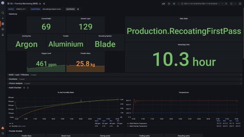 For owning multiple AddUps 3D printerWith a large print area, Dashboards can collect, consolidate and display data from multiple machines simultaneously. Data from all systems can be presented on a central home screen, and the devices do not even need to be located in the same manufacturing facility.