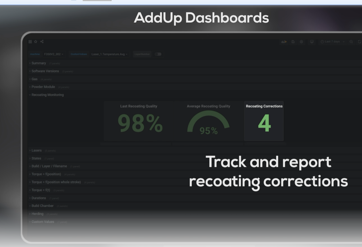 AddUp Dashboards is a general-purpose program capable of providing overall parameter inspection during the 3D printing process. It features easy-to-read dashboards that display real-time and historical process data for comprehensive traceability and analysis.