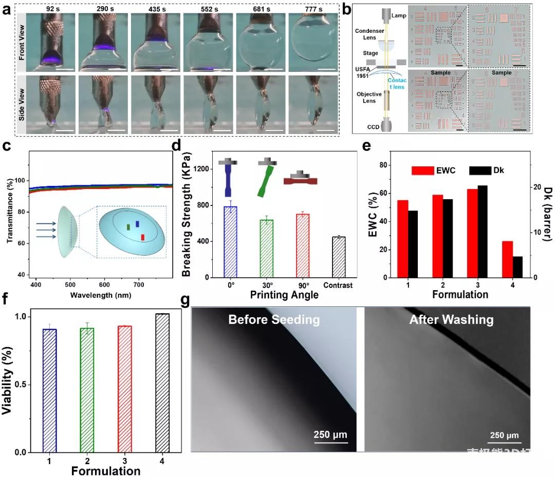 As shown in Figure 3a, with the continuous lifting of the support plate, a contact lens structure with smooth sidewalls can be obtained. The swollen contact lens structure has excellent optical properties, and its imaging resolution and light transmittance are as high as 228.1 lp/mm and 96% (Figure 3b-c). The mechanical properties of the dumbbell-shaped structure printed from different angles are characterized. It can be seen from Fig. 3d that the swollen dumbbell-shaped structure has isotropic mechanical properties without directional dependence, which further illustrates the elimination of the step effect. At the same time, the swollen contact lens has a suitable balance of water content and oxygen permeability (Figure 3e), and the swelling structure itself and the immersion solution are non-cytotoxic and have low cell adhesion characteristics (Figure 3f-g), indicating that it can Meet the biocompatibility requirements of practical applications.