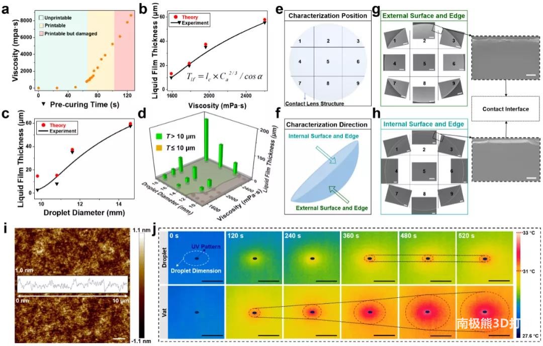 3D printingThe UV curable silicone hydrogel resin system is used in the preparation of contact lens structures (Figure 1a). In the continuous printing process, the cured structure is always restricted by the interface between the liquid resin and the cured structure, which makes the thin liquid resin film wrap around the cured structure. Through the control of the restricted liquid film, the gap between adjacent cured layers can be filled without excessive coating, the step effect can be eliminated, and a three-dimensional structure with smooth sidewalls can be obtained (Figure 1b).