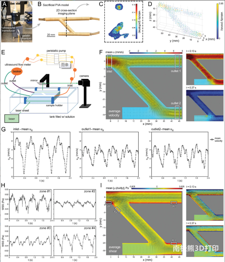 Particle image velocimetry and computational fluid dynamics models show close agreement in quantifying the flow velocity and wall shear stress in bioprinted arteries. These data can be used to identify the highest value of shear stress changes and areas that are prone to narrowing.