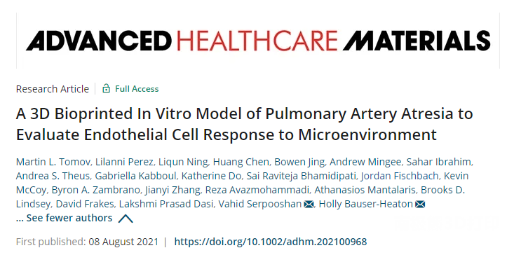 Tomov, ML, Perez,L., Ning, L., Chen, H., Jing, B., Mingee, A., Ibrahim,S., Theus, AS, Kabboul, G., Do, K., Bhamidipati, SR, Fischbach, J., McCoy, K., Zambrano, BA, Zhang, J., Avazmohammadi, R., Mantalaris, A., Lindsey, BD, Frakes, D., Dasi, LP, Serpooshan, V., Bauser -Heaton,H., A 3D Bioprinted In Vitro Model of Pulmonary Artery Atresia to EvaluateEndothelial Cell Response to Microenvironment. Adv. Healthcare Mater. 2021,2100968. https://doi.org/10.1002/adhm.202100968