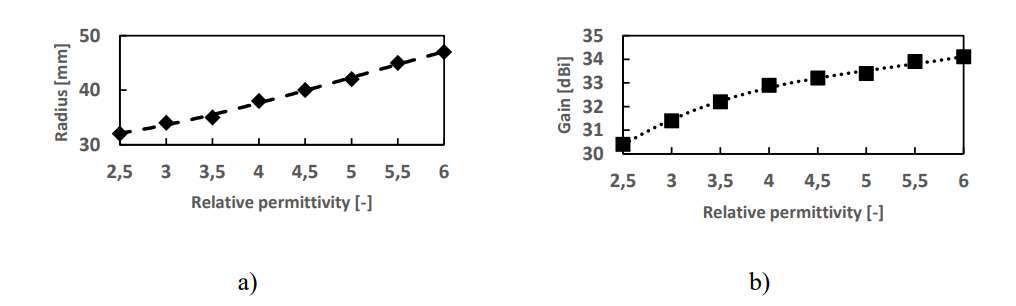 The ideal radius a) and the maximum gain b) depend on the relative permittivity of the lens material.
