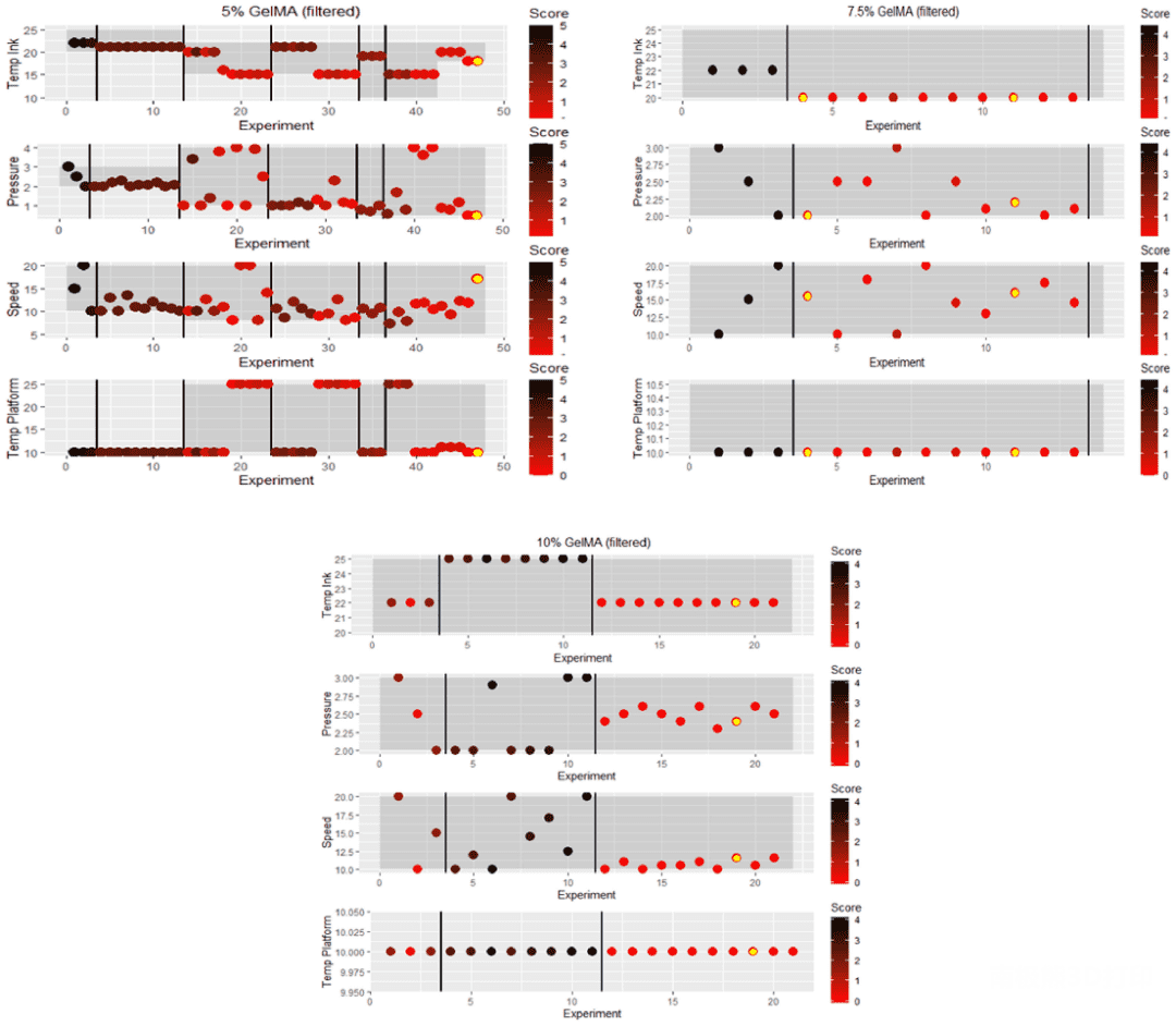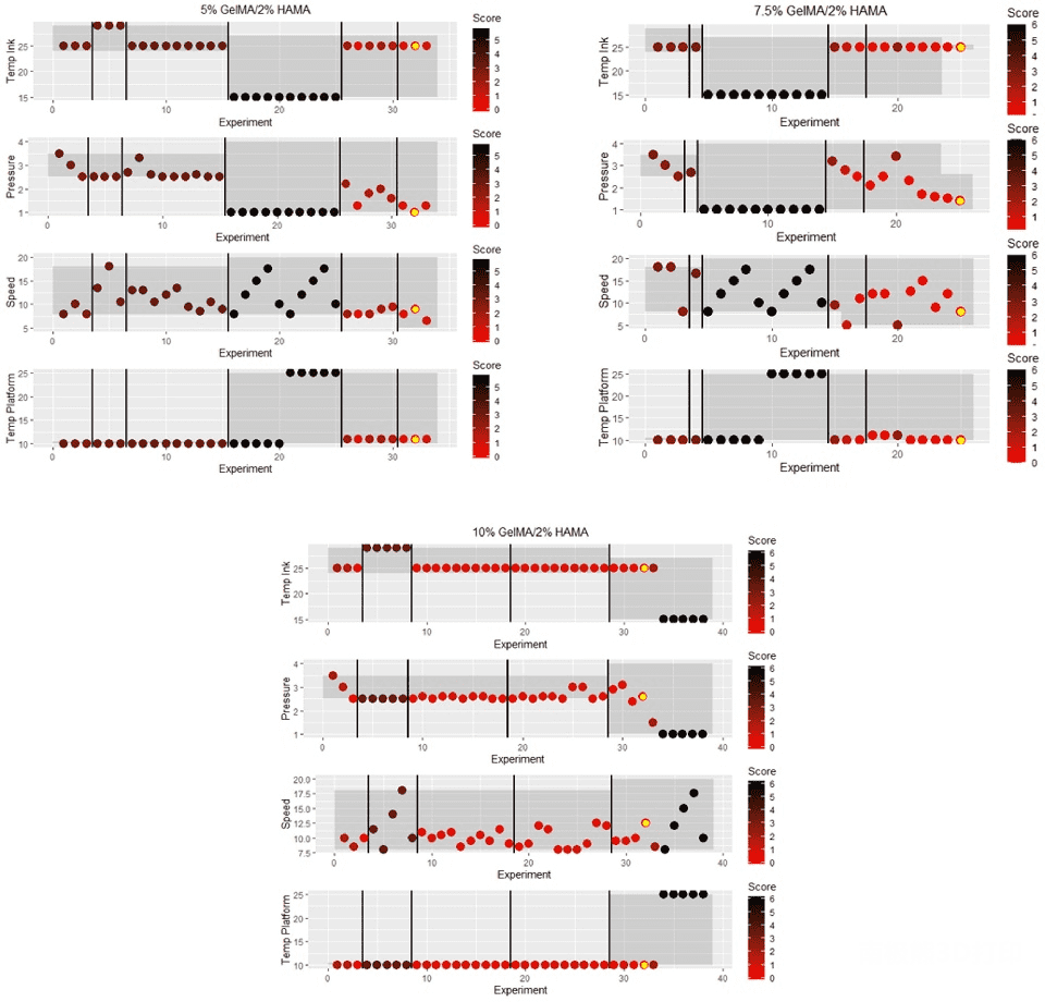 The changes in the range of printing parameters including the experimental results are shown in Figures 4 and 5. The total print score was obtained by calculating the two values of the filament formation fraction and the layer stacking fraction. A total printing score of “0” demonstrates the optimal printing conditions for GelMA and GelMA/HAMA mixtures (yellow dots in Figures 4 and 5). The researchers found that the bioinks achieved ideal filament formation of 10%, 7.5% and 5% (w/v) GelMA at temperatures of 22°C, 20°C and 18°C, respectively. Whereas a slightly elevated temperature of 25°C could achieve a filament morphology score of “0” for all three GelMA/HAMA concentrations. The shaded area represents the range of each print parameter, and the black line segments represent each batch. In a space of 6000 to 10,000 possible print settings, the Bayesian optimization algorithm was able to perform at 10%, 7.5% and 5% (w/v) GelMA’s 19th, 4th and 47th experiments and 10%, 7.5% and 5% (w/v) Optimal printer settings found in experiments 32, 25 and 32 of 5% (w/v) GelMA/2% (w/v) HAMA mixed inks.