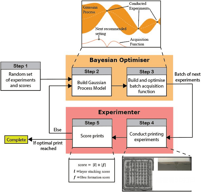The framework first provides the Bayesian optimizer with a random set of variable bioink mix ratios and printer settings (bioink storage temperature, pressure, printhead speed, and platform temperature), as well as filament formation and layer stacking performance-based Relevant print scores. The system is a black-box system containing many complex relationships between input variables and output print scores. To overcome this problem and achieve the search goal, researchers use past experimental data based on a Bayesian optimizer to construct probability estimates for black-box systems modeled by Gaussian processes. The mean and covariance of the model were used to construct an acquisition function that was optimized to recommend the next printer setting to test. This recommended printer setting is defined as the location where the Bayesian optimizer expects the highest probability of finding the best print score. Experiment proposals provided by the optimizer are provided to the experimenter in batches at each iteration to allow the experimenter to run and score multiple experiments at once.