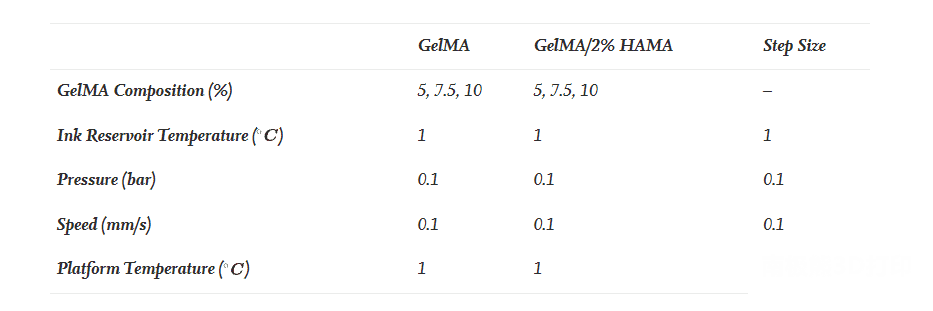 In terms of materials, the researchers fabricated lattice structures (10 × 10 × 2.5 mm) with 500 μm wide strands and 130 μm splices by extrusion printing using an EnvisionTEC 3D Bioplotter (GmbH Germany). The bioink ratios used in the study were: 10% (w/v) GelMA, 7.5% (w/v) GelMA, and 5% (w/v) GelMA; 10:2% (w/v) GelMA/HAMA , 7.5:2 % (w/v) GelMA/HAMA and 5:2 % (w/v) GelMA/HAMA, covering a broad viscosity range from low, medium to high. After each layer was deposited, 20 s of UV irradiation was used to crosslink the bioink.