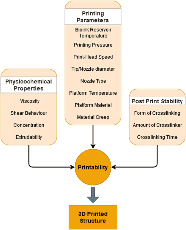 Bioinks are an essential component of the bioprinting process, serving as a delivery medium for cells and growth factors, and as a support material for cell adhesion, proliferation, and thriving after printing. While maintaining cytocompatibility, an ideal bioink should possess two key physical properties: “printability” to form complete 3D structures, and “mechanical stability” for good shape fidelity of printed structures . Therefore, 3D-printed bioinks should preferably adopt fluid properties with reasonable printability during their extrusion process. Numerous factors related to physicochemical properties, printing parameters, and post-print curing play an important role in optimizing the printability of any bioink (Figure 1). The rheology of bioinks mainly depends on their viscoelasticity and shear behavior, which in turn strongly depends on the concentration formulation of the ink. In addition, the extrudability and extrusion uniformity of the bioink also contribute to the printability. In addition to the physical properties of the bioink, the temperature of the 3D printer, nozzle diameter, nozzle type, printhead speed, and platform temperature can all improve printability.