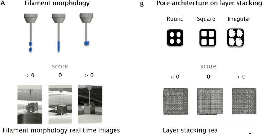 In terms of algorithms, the researchers constructed a Bayesian optimizer-based “black box system” framework to study the effects of a series of parameters such as bioink storage temperature, pressure, print head speed and platform temperature on printability. The results of the experiments are fed back to the experimenter, who then runs printer tests with recommended settings and scores performance, and these results are fed back into the optimizer, which iterates over and over until the best printing result is achieved.