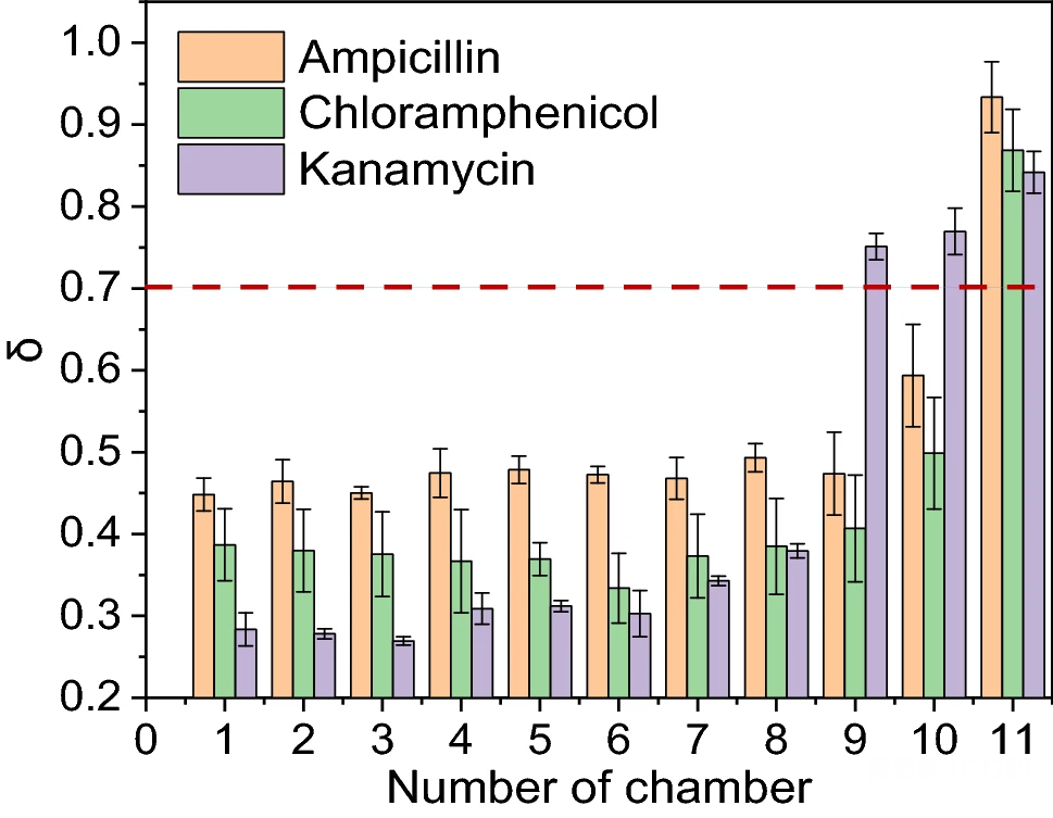 Medication difficulty and patient mortality in the treatment of multidrug-resistant infections. Obtaining the antibiotic drug sensitivity results of microorganisms in time is of great significance for the accurate diagnosis and drug treatment of clinical multidrug-resistant infections. In this study, a microdroplet chip based on flow resistance was designed, combined with the application of resazurin biological indicator, which can indicate the growth of microorganisms under different concentrations of antibiotics within 5 h. The chip has several independent retention chambers, which can automatically generate antibiotic concentration gradients and form independent droplets for detecting bacterial susceptibility. The chip simplifies control operations and device integration, shortens drug sensitivity detection time compared to traditional methods, and has good application prospects.