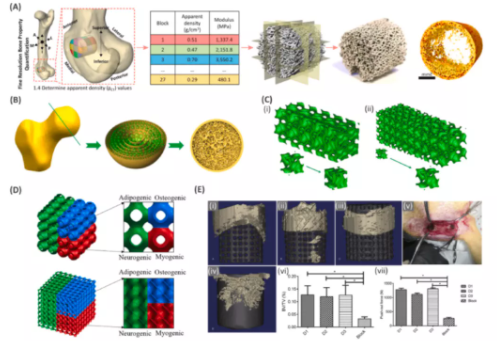 Examples of functionally graded scaffolds designed to meet conflicting requirements in bone architecture. (A) Random porous scaffold with gradient porosity designed based on bone local stiffness. (B) Steps to generate porous scaffolds using probability spheres of various sizes based on the Voronoi-Tessellation method. (C) Sheet-based gyroscopic structure with (i) graded porosity created by varying sheet thickness and (ii) unit cell size. (D) Local stiffness design within the scaffold by varying the sheet thickness to simulate specific tissue types. (E) Bone regeneration within scaffolds of various pore sizes, including (i) 300-500 μm, (ii) 200-600 μm, (iii) 100-700 μm, and (iv) (v) non-porous after implantation Operation. (vi) Bone volume per total volume and (vii) Push-out force (N) of the scaffold.