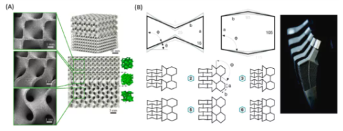 Examples of porous metal biomaterials with pore-shaped gradients. (A) Multiple topologies within the sheet-based TPMS scaffold with smooth transition from diamond shape to gyroscope shape. (B) Hybrid implant designs including conventional and auxetic lattices with various internal angles.