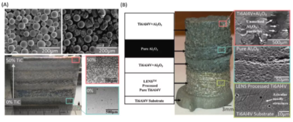Figure: Example of a metal additive manufacturing (AM) material gradient for biomedical structures. (A) Laser melting deposition of Ti-6Al-4V enhanced TiC particles with TiC concentrations ranging from 0% to 50% from bottom to top. (B) Laser-engineered net-shape O3 and pure Al2O3 of the multi-material structure with layers of pure Ti-6Al-4V, Ti-6Al-4V + Al2.
