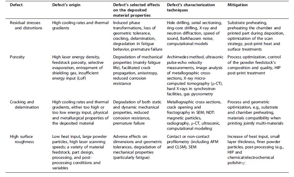 DED is a non-equilibrium processing technology with fast cooling rate and large thermal gradient. These thermal conditions can lead to complex phase and microstructural changes, non-uniform residual stresses, deformation, porosity, cracking, and consequently corrosion resistance degradation, mechanical behavior (such as ductility and fatigue strength), and premature failure. These are the topics of this section. The formation mechanism, measurement, modeling, and mitigation of these defects are discussed. Table 3 summarizes some of the major defects, their sources, their impact on material properties and component selection, and their characterization techniques. The following subsections discuss them in more detail.