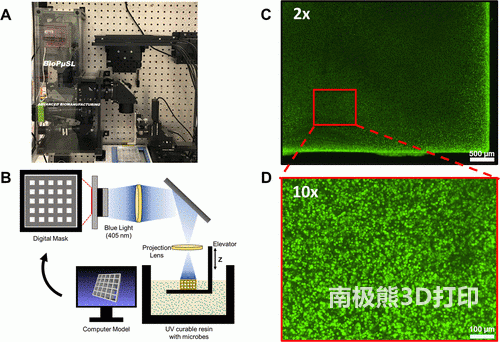 By using light and bacteria-infused resin to produce 3D patterned microorganisms, the research team at Lawrence Livermore National Laboratory successfully printed a thin layer of artificial biological membrane similar to the survival of microbial communities ubiquitous in the real world. The researchers suspended bacteria in a photosensitive bioresin and used LED light from the Stereolithography Equipment (SLAM) 3D printer developed by LLNL for microbial bioprinting to “capture” the microbes in the 3D structure. The projection stereolithography machine can print at a high resolution of 18 microns-almost as thin as the diameter of a human cell.