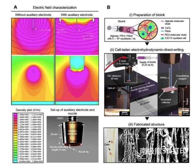 First, the researchers designed a nozzle with an auxiliary electrode, which has a more evenly distributed electric field than a single tip. The printing material is composed of alginate/PEO/fibrin bio-ink which is carried by C2C12 on myoblasts, and the cell-carrying hydrogel is sprayed and deposited on the grounding plate under suitable electric direct writing printing conditions to form the designed cell-carrying The microfiber structure is shown in Figure 1.