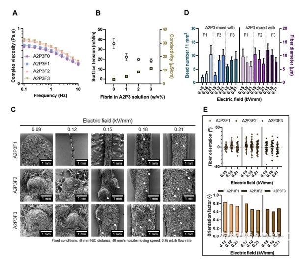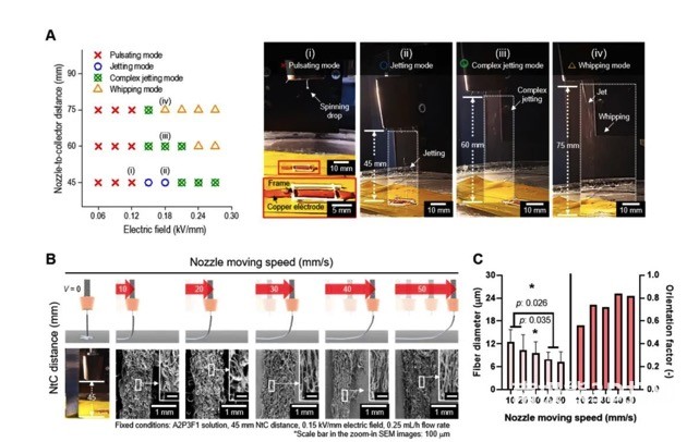 The researchers further explored suitable printing parameters, including the applied electric field, nozzle distance, and printing speed. The effect of each parameter is shown in Figure 3. Finally, the electric field strength is 0.15kV/mm, the nozzle distance is 45mm, and the printing speed is 40mm/s to prepare the cell-carrying microfiber scaffold.