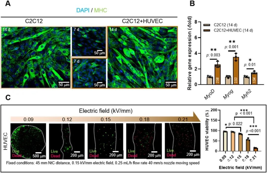 Next, the researchers studied the effect of the loading structure of HUVECs on the myogenic activity of the co-culture structure, Figure 6. The results confirmed that the co-culture of C2C12 and HUVECs is beneficial to muscle tissue regeneration. Before using C2C12 and HUVECs to prepare the composite fiber structure, the cell viability and fiber morphology (0.09-0.21 kV/mm) of HUVECs under the electric direct writing process were tested. According to the results, the parameters of 0.15 kV/mm were finally selected to make the carrier. The fiber structure of HUVECs.