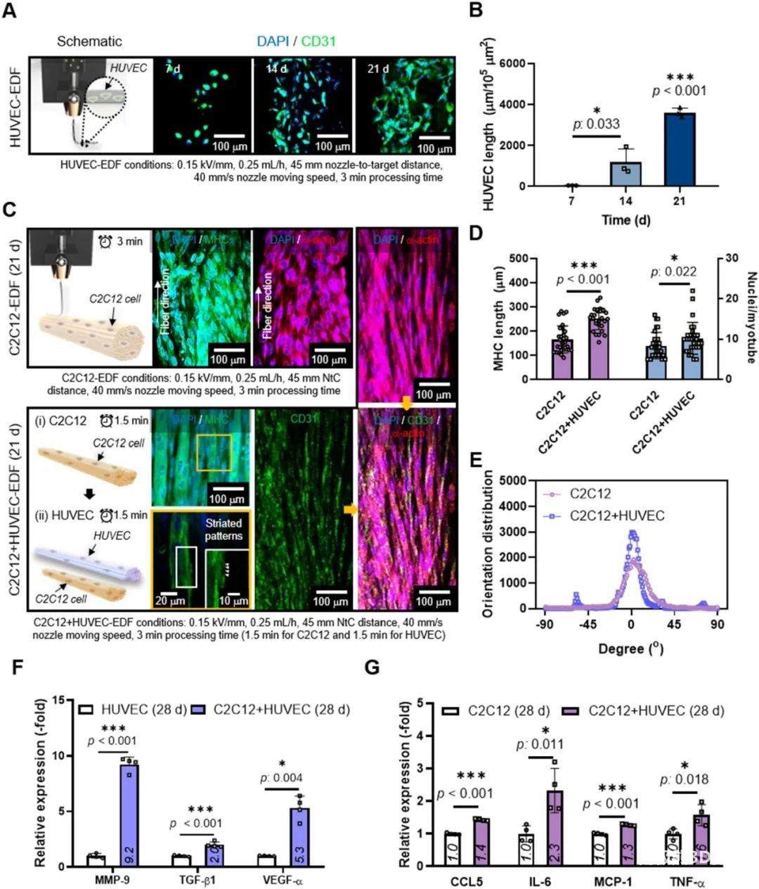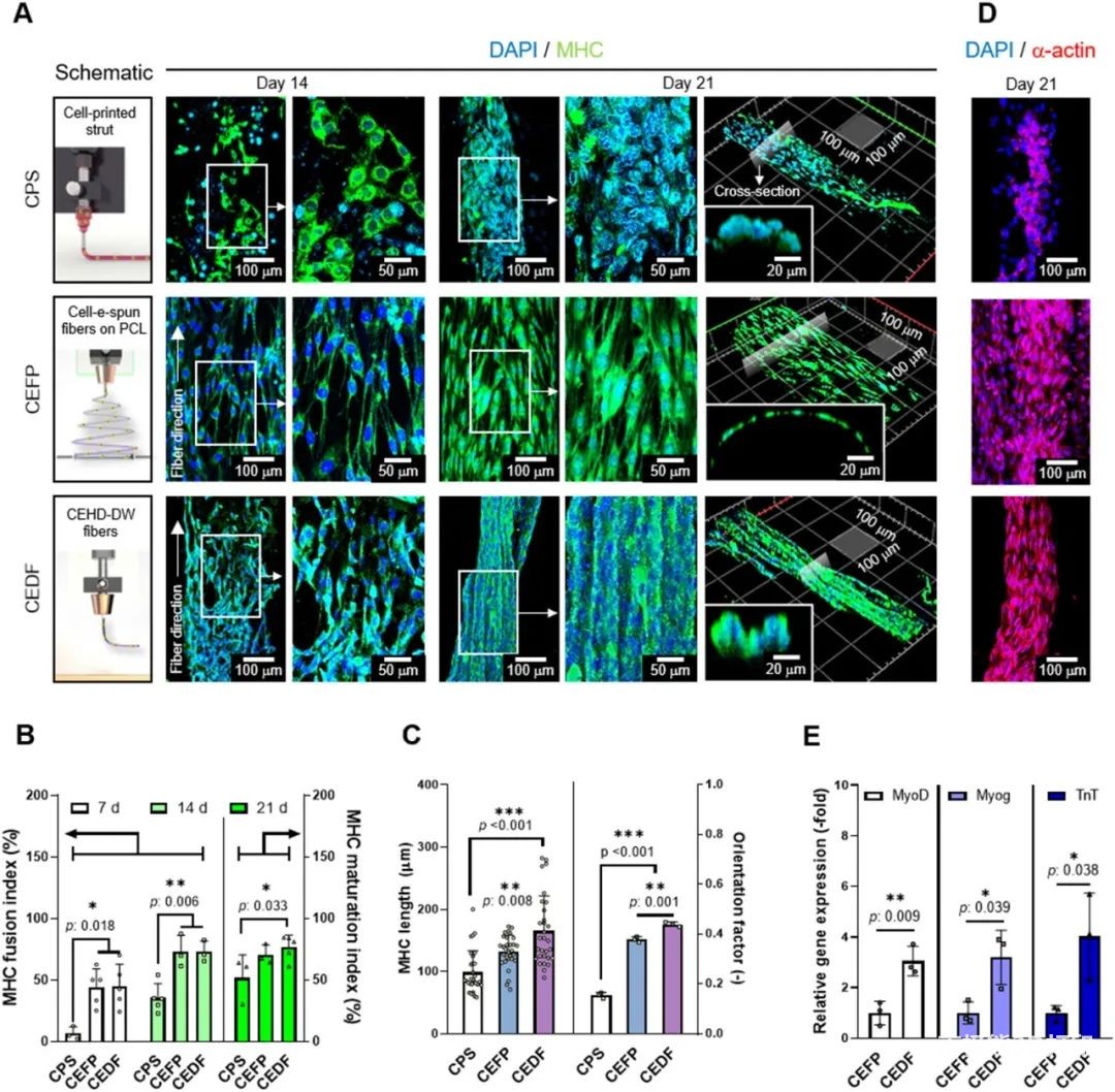 The researchers further compared the traditional extrusion biological3D printing, The in vitro cell characterization of traditional cell electrospinning and electric direct writing of cell fibers. The results are shown in Figure 5.Extrusion Biology3D printingThe morphology of the myosin heavy chain (MHC) on the fiber is random; while the traditional cell electrospinning and electrical direct writing cell fibers show a directional arrangement due to the ultrafine fiber morphology. However, the arranged cells only cover the surface of the traditional electrospinning group, and the cells are connected to each other in bundles on the electric direct writing fibers. This effective cell arrangement can simultaneously have high cell density and appropriate mechanical properties, as well as orientation properties. Other quantitative results also indicate that the electrical direct writing of cell fibers is beneficial to the arrangement and differentiation of myoblasts, and promotes myogenic differentiation and maturation of myotubes. Therefore, the researchers used electrical direct-write cell fibers to co-culture C2C12 myoblasts and HUVECs.